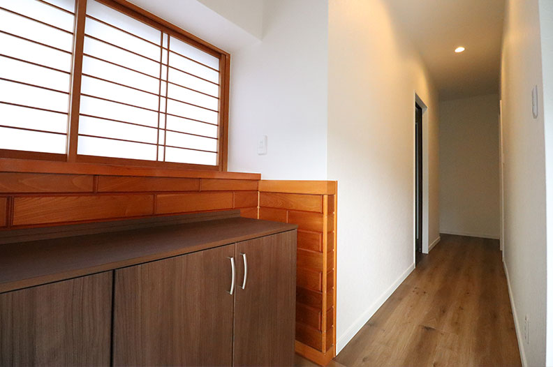 旧和室と縁側の一部を和紙畳の空間で、吊押入のあるモダンな和室へ。食事やくつろぐ空間であるリビングダイニングからつながるモダンな和室。全体的に明るく・広々とした空間となりました。
